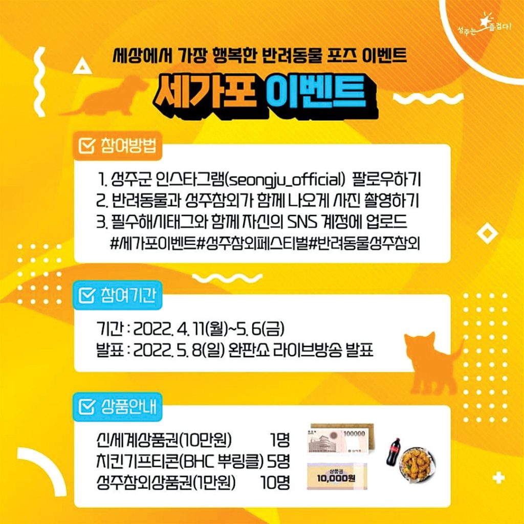 이와 함께 이색적인 행사로 반려동물을 키우는 가구가 많이 늘어난 만큼 반려동물과 함께 참여하는 세상에서 가장 행복한 반려동물 포즈 이벤트 ‘세가포 이벤트’도 진행 중이다. 성주군 공식 유튜브 채널을 구독한 후 반려동물이 참외를 먹는 모습을 촬영하여 필수해시태그와 함께 SNS 계정에 올리면 된다. 5월 6일(금)까지 응모 가능하며 5월 8일(일) 축제 프로그램인 완판 프로젝트 라이브 방송에서 16편의 수상작을 발표할 예정이다. 자세한 내용은 성주군 축제 홈페이지(www.sj.go.kr/sjlife)와 성주참외 공식 쇼핑몰(www.sjchamoe.com)에서 확인할 수 있다.