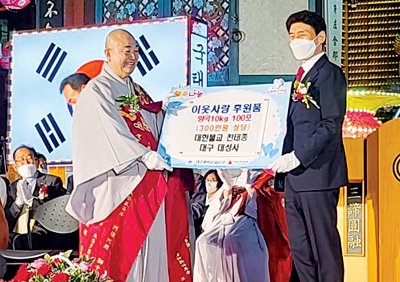 대한불교 천태종 대성사(주지스님 도원)는 지난 7일 부처님 오신 날을 맞아 백미 10kg 100포를 달서구에 전달했다.