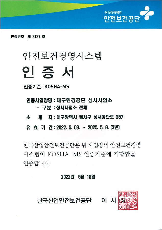 김일관 성서사업소장은 “최근 중대재해처벌법이 시행되면서 더욱더 안전에 만전을 기하기 위해 다방면으로 노력하고 있다”라고 밝히며 “안전보건경영시스템(KOSHA-MS)인증 취득 후에도 안주하지 않고 항상 안전사고 예방을 위한 제도와 프로세스를 개선하는 등 선제적 재해예방활동에 힘쓰겠다”라고 말했다.