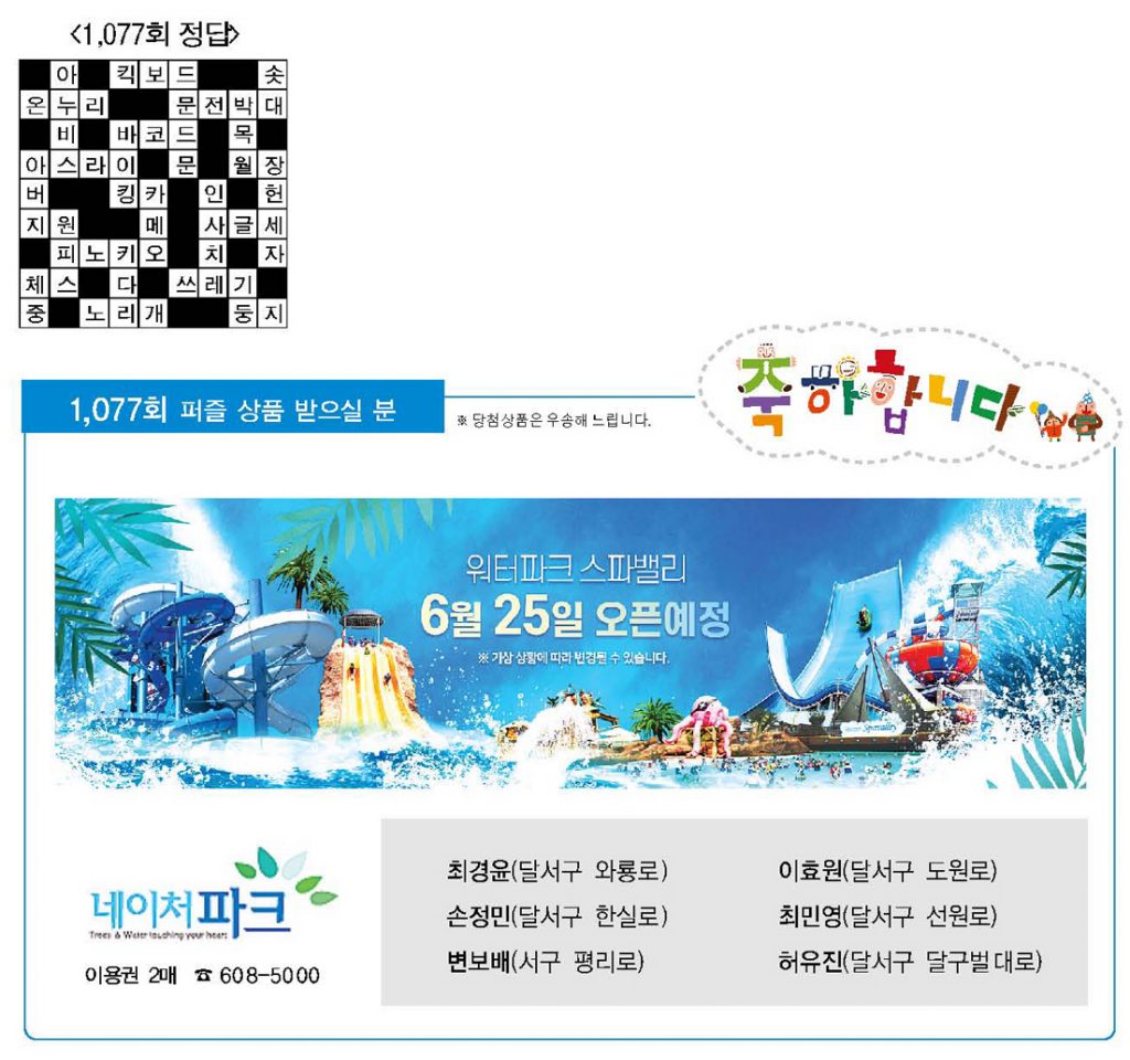 ♣ ‘가족과 함께 풀어보세요’정답을 아시는 분은 본사 편집부로 보내주시기 바랍니다. 7월 5일까지 도착된 엽서 중에서 추첨을 통해 상품을 드립니다. 주소를 정확히 기재해 주십시오. 당첨상품을 우송해 드립니다.