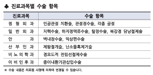 정형외과, 일반외과, 안과, 산부인과, 비뇨의학과, 이비인후과 수술 및 간병서비스 제공