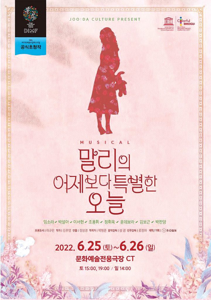 그 속에서 말리가 던지는 고민들은 오랜 시간 닫아두었던 마음 속 서랍장을 꺼내게 되어 말리의 어제보다 특별한 오늘은 어린 시절의 아픔을 딛고 성인이 되어 성장하고 있는 이 세상 모든 어른이들에게 위로와 치유를 선물하는 작품이자, 어른과 아이가 함께 보는 성장 동화다. 동화 같은 이야기 속에서 지금의 말리와 어린 말리가 던지는 고민들이 세상 모든 어른이들에게 닿을 수 있기를 바란다. 자세한 내용은 문화예술전용극장 CT 홈페이지를 통해 확인할 수 있다. 전석 4만 원.