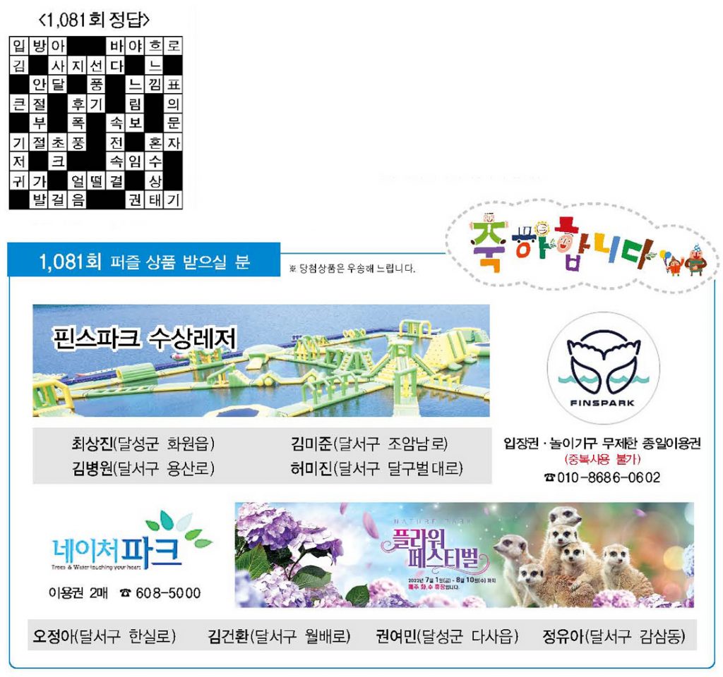 ♣ ‘가족과 함께 풀어보세요’정답을 아시는 분은 본사 편집부로 보내주시기 바랍니다. 8월 9일까지 도착된 엽서 중에서 추첨을 통해 상품을 드립니다. 주소를 정확히 기재해 주십시오. 당첨상품을 우송해 드립니다.