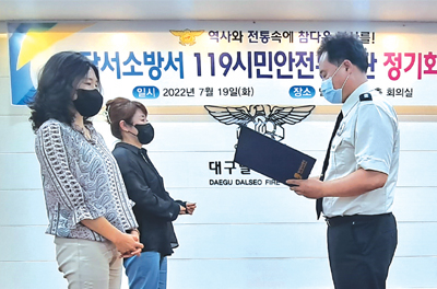 달서소방서(서장 이진우)는 지난 19일 오후 6시 달서소방서 3층 회의실에서 달서119시민안전봉사단(단장 임성희)이 주최를 해 사회의 도움이 필요한 지역아동에게 2년간 생활비(월 10만 원 상당)를 지원하는 장학증서를 수여했다. 이날 행사에서는 지역사회 발전과 소방안전문화 확산을 통하여 시민의 생명과 재산보호를 위해 헌신한 조연화, 김미소 부단장을 우수단원으로 선정하고 표창했다.