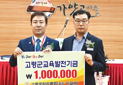 고령로타리클럽 회원 일동이 지난 15일(금) 대가야읍 가얏고마을에서 진행된 고령로타리클럽(회장 이길재) 회장 이·취임식에서 교육발전기금 100만원을 기탁했다.