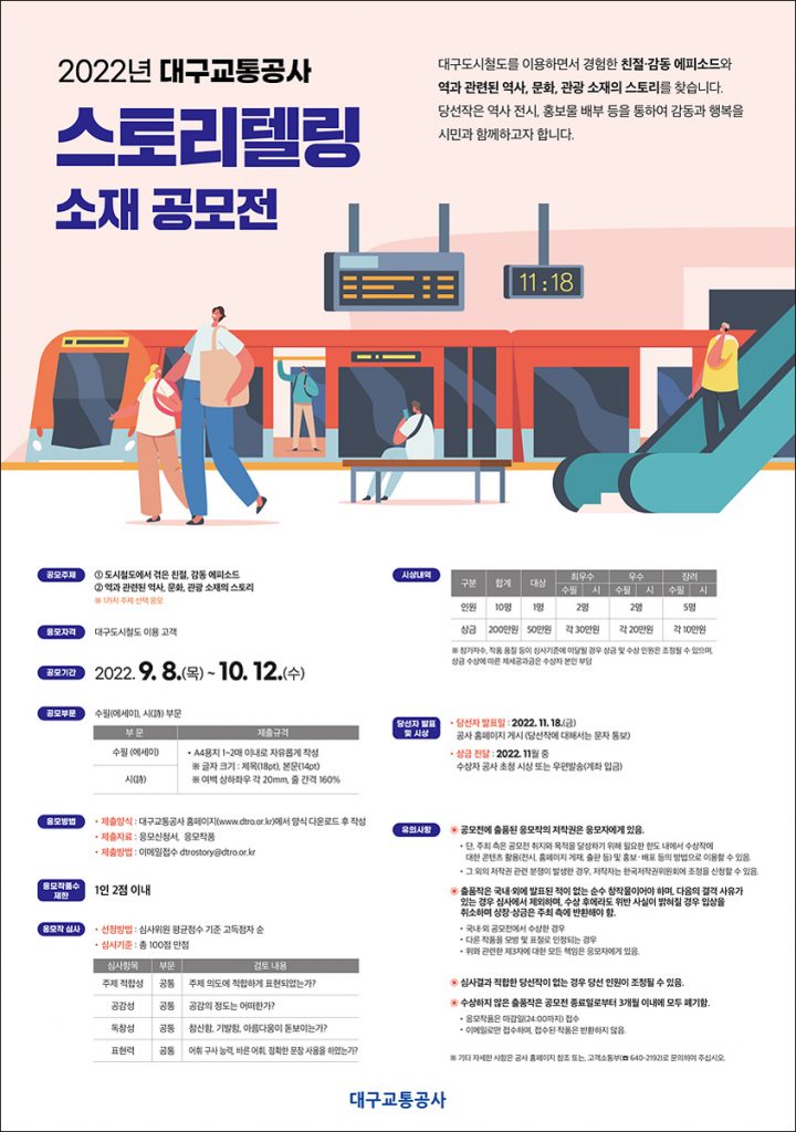 대구교통공사는 도시철도 이용 고객의 친절·감동 에피소드 발굴과 공유를 통해 시민과 소통하고자 ‘2022년 스토리텔링 소재 공모전’을 개최한다.