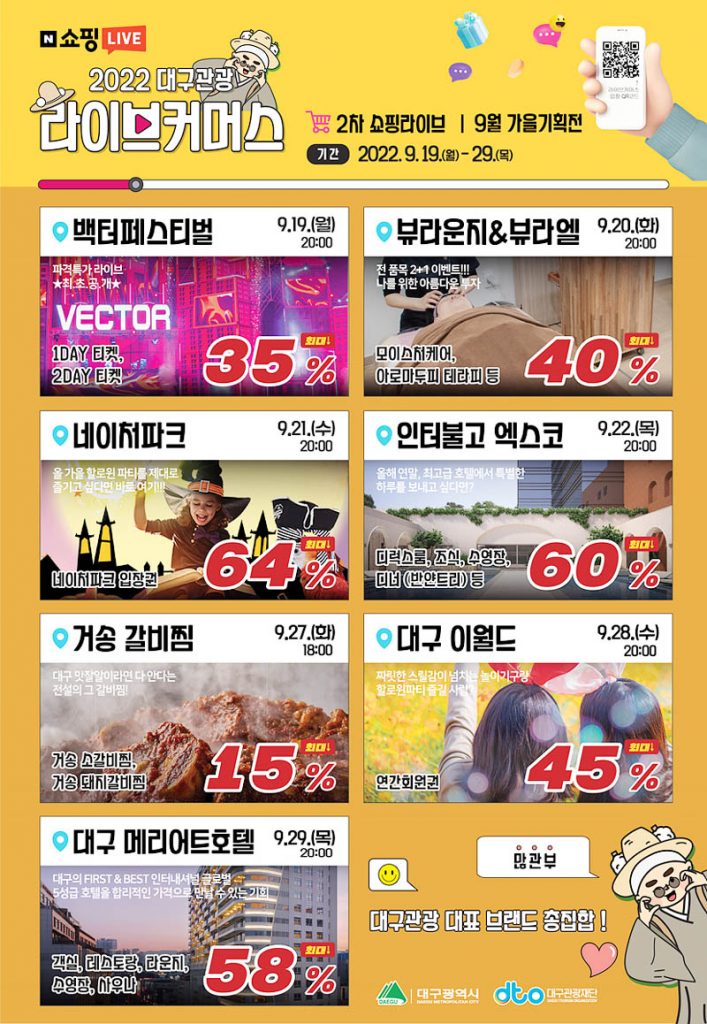 대구시와 관광재단은 9월 29일(목)까지 2022 대구관광 라이브커머스 ‘클릭 한 번으로 떠나는 대구여행’ 2차 9월 특별기획전을 네이버 쇼핑라이브로 진행한다.