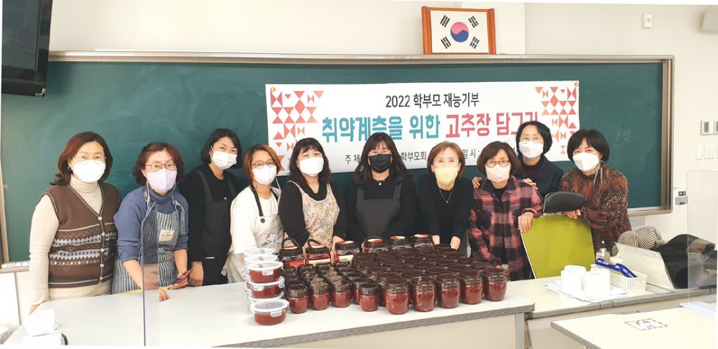 달성중학교(교장 서재용) 학부모회는 지난 10일(목) 달성중학교에서 학부모 재능 기부로 취약계층을 위한 고추장 담그기 행사를 진행하고 40여 취약계층에 고추장과 훈훈한 이웃 사랑을 전달했다.