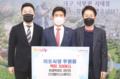 롯데백화점 상인점(점장 박찬욱)과 프리&메지스(대표 김광배)는 지난 24일(목) 백미 300㎏을 달서구에 기탁했다.