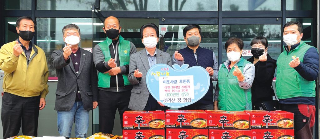 북구 노원동 소재 ㈜기산(대표 정희섭)은 지난 22일(화) 취약계층을 위한 백미 10kg 20포, 라면 30개입 20상자(100만 원 상당)를 달서구 도원동(동장 최우석)에 후원했다.