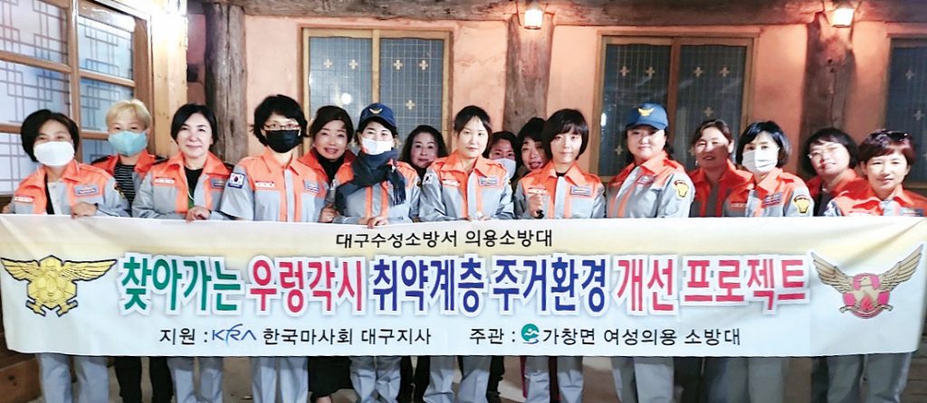 가창면 의용소방대(회장 윤세미)는 관내 취약계층 주거환경개선을 위한 ‘찾아가는 우렁각시 사업’을 실시한다. 이 사업은 한국마사회 대구지사 지원금 400만 원으로 실시되며, 회원들이 직접 주거환경이 열악한 25가구를 방문해 어르신들이 혼자 정리하기 힘든 집안 물건들을 정리해 주고 청소해 주는 사업으로 다음달 12월까지 추진할 계획이다.