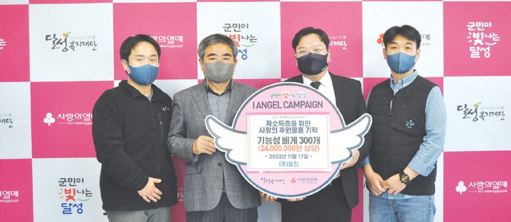 ㈜요집(대표 우동학)은 지난 17일(목) 기능성 베개 300개(2,400만 원 상당)를 달성복지재단(이사장 차준용)에 기탁했다.
