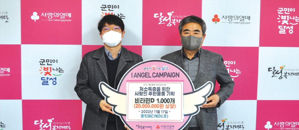홍익메디케어(주)(대표 엄덕현)는 지난 17일(목) 비타민D(2,000만 원 상당)를 달성복지재단(이사장 차준용)에 기탁했다.