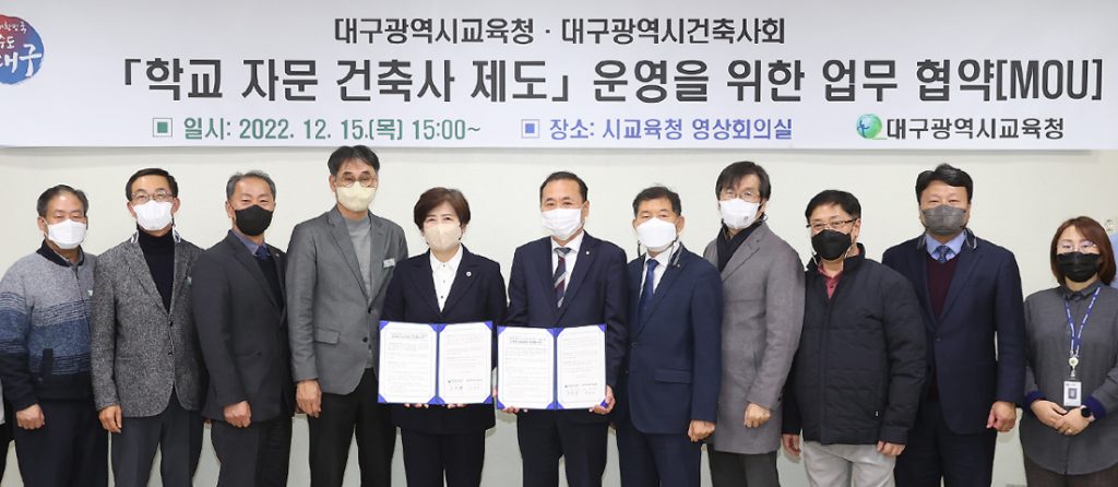 대구시교육청(교육감 강은희)은 지난 15일(목) 대구시건축사회와 ‘학교 자문 건축사 제도’ 운영을 위한 업무 협약(MOU)을 체결했다. ‘학교 자문 건축사 제도’는 학교에서 각종 시설사업 자체 추진 시 체계적이고 신속한 기술 자문을 제공하기 위해 마련한 제도로서 2023년 1월부터 시행한다. <자료제공:대구시교육청>