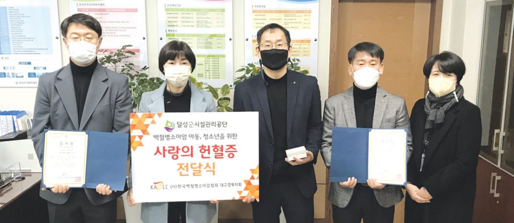 달성군시설관리공단(이사장 김정화)은 지난 13일 (화) (사)한국백혈병소아암협회(대구, 경북지회)에 헌혈증서 120장을 기부했다.