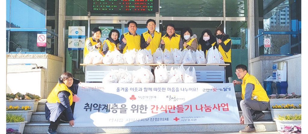 다사읍 지역사회보장협의체(공공위원장 표준식, 민간위원장 정무상)는 지난 14일(수) 관내 차상위계층에 직접 만든 간식(빵)과 두유 등을 전달하는 ‘취약계층을 위한 간식만들기 나눔사업’을 진행했다.