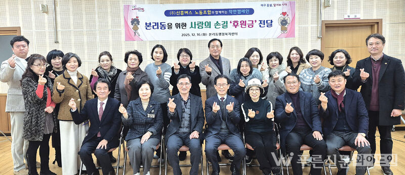 ㈜신흥버스 노동조합이 달서구 본리동에 ‘착한캠페인’ 후원금 1,279만 원을 기탁했다. 후원금은 저소득층, 독거노인, 장애인 가정 등 취약계층 지원에 사용된다.