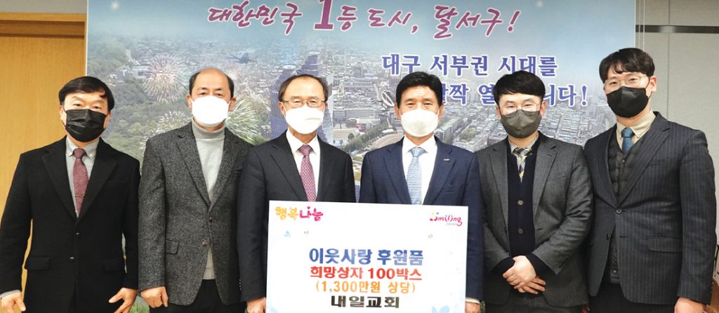 내일교회(담임목사 이관형)는 지난 21일(수) 따뜻한 겨울을 위한 희망상자 100개(1,300만 원 상당)를 달서구에 기탁했다.