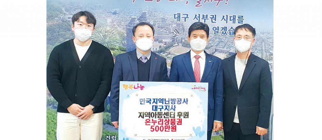 한국지역난방공사 대구지사(지사장 권동욱)는 지난 20일(화) 관내 저소득 아동들에게 지원해 달라며, 온누리상품권 500만 원을 달서구에 기탁했다.