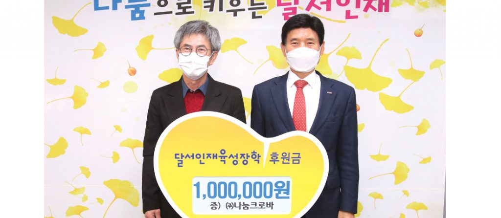 사회적기업 (주)나눔크로바(대표 성기수, 정문옥)는 지난 20일(화) 100만 원의 후원금을 달서인재육성장학재단에 전달했다.