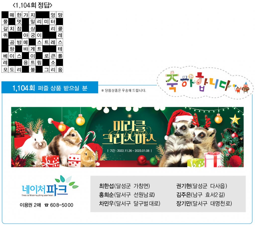 ♣ ‘가족과 함께 풀어보세요’정답을 아시는 분은 본사 편집부로 보내주시기 바랍니다. 2023년 1월 17일까지 도착된 엽서 중에서 추첨을 통해 상품을 드립니다. 주소를 정확히 기재해 주십시오. 당첨상품을 우송해 드립니다.