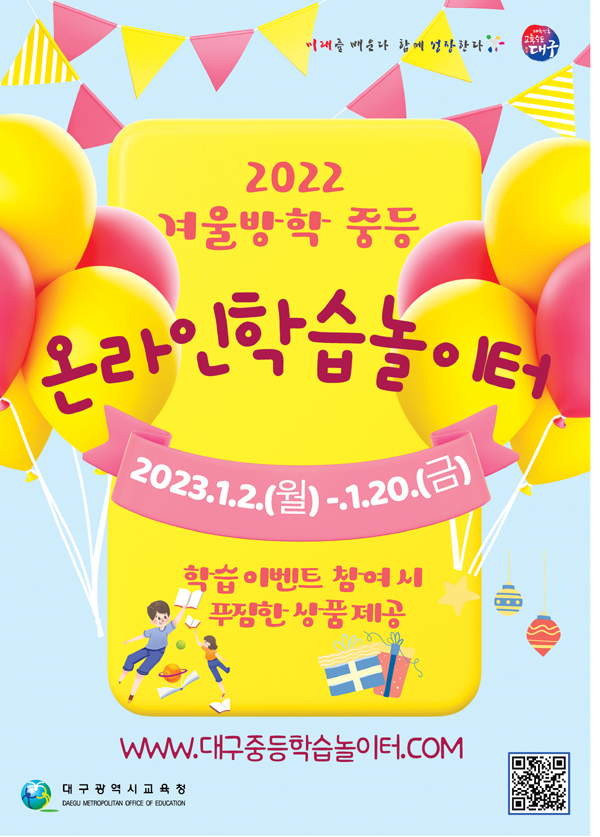 대구시교육청(교육감 강은희)은 겨울방학 중 학생들의 학습동기를 증진하고 자기주도적인 학습습관을 형성하기 위해 1월 2일(월)~20일(금)까지 3주간 ‘2022. 대구 중등 온라인학습놀이터’를 운영한다.