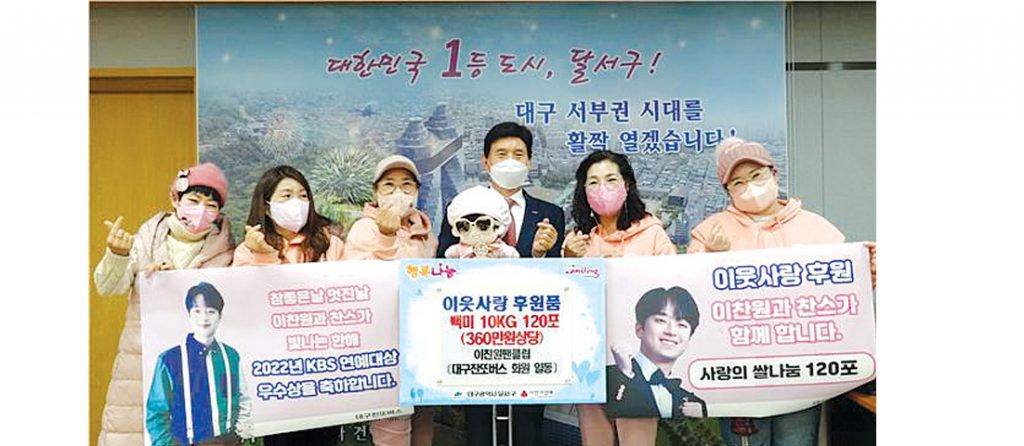 이찬원팬클럽 ‘대구찬또버스’ 회원들은 지난 2일(월) 백미 10㎏ 120포(360만 원 상당)를 달서구에 기부했다.