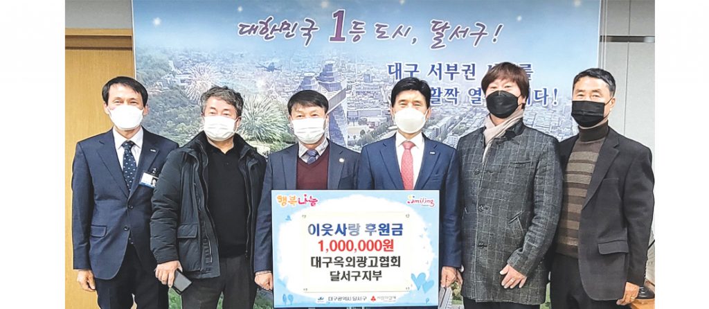 대구옥외광고물협회 달서구지부(지부장 권용범)는 지난해 12월 26일(월) 이웃사랑 후원금 100만 원을 달서구에 기탁했다.