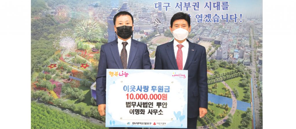 법무사법인 루안 (대표 이명화)은 지난해 12월 29일(목) 이웃사랑 후원금 1,000만 원을 달서구에 기탁했다.