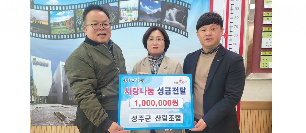 성주군 산림조합(조합장 김재국)은 지난해 12월 28일(수) 성주읍행정복지센터를 찾아 성금 100만 원을 기탁했다.