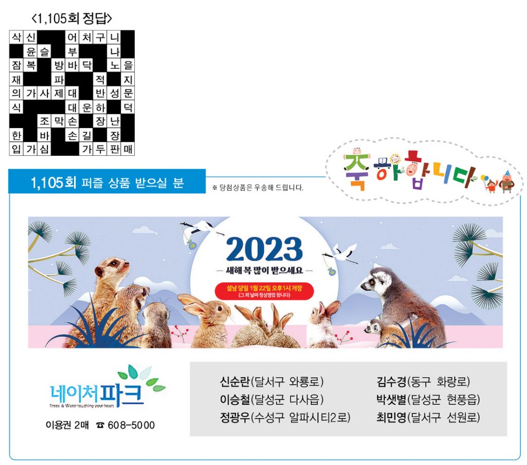 ♣‘가족과 함께 풀어보세요’정답을 아시는 분은 본사 편집부로 보내주시기 바랍니다. 2023년 1월 31일까지 도착된 엽서 중에서 추첨을 통해 상품을 드립니다. 주소를 정확히 기재해 주십시오. 당첨상품을 우송해 드립니다.