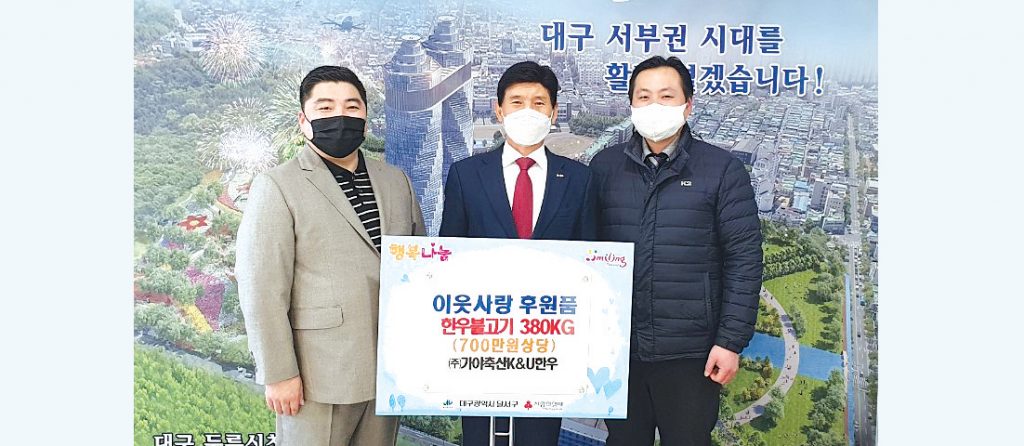 ㈜가야축산K&U한우(대표 김창일)는 지난 3일(화) 한우불고기 및 곰국거리 380㎏(700만 원 상당)를 달서구에 기탁했다.