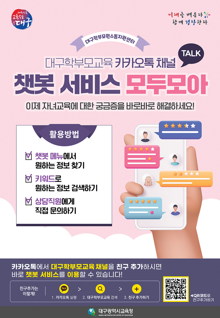이번 대구학부모교육 챗봇 ‘모두모아’가 운영되면 학부모들의 자녀교육 정보 접근성과 편의성이 증대되고, 공교육에 대한 신뢰성과 만족도를 높일 것으로 예상된다.