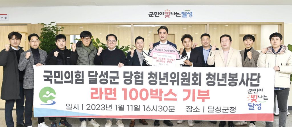 국민의힘 청년봉사단(위원장 신달호)은 지난 11일(수) 달성군 저소득 가구에 전달해 달라며 라면 20개입 100박스(136만 원 상당)를 달성군에 기탁했다.