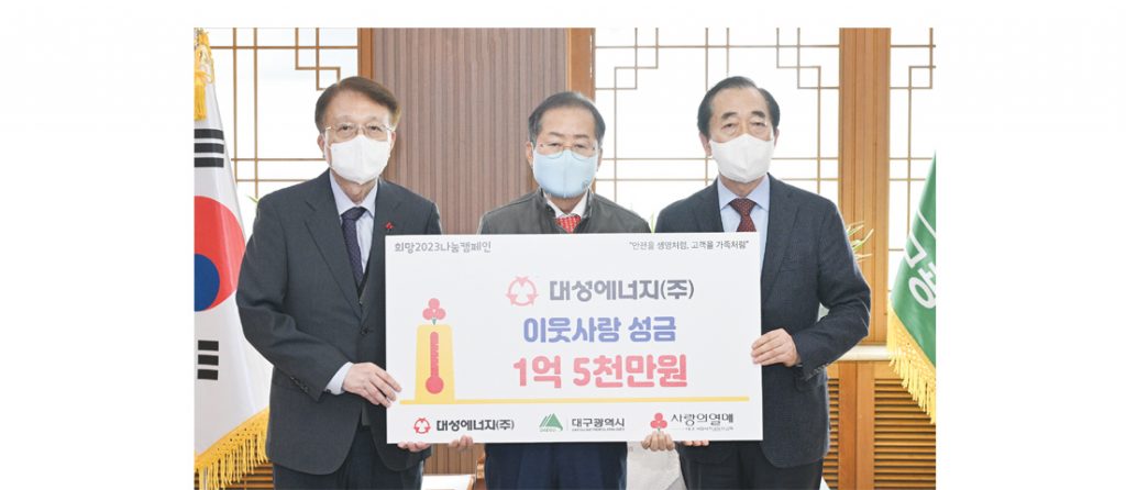 대성에너지, 이웃사랑 성금 1억 5,000만 원 전달대성에너지는 지난 12일(목) 이웃사랑 성금 1억 5,000만 원을 대구사회복지공동모금회에 전달했다.
