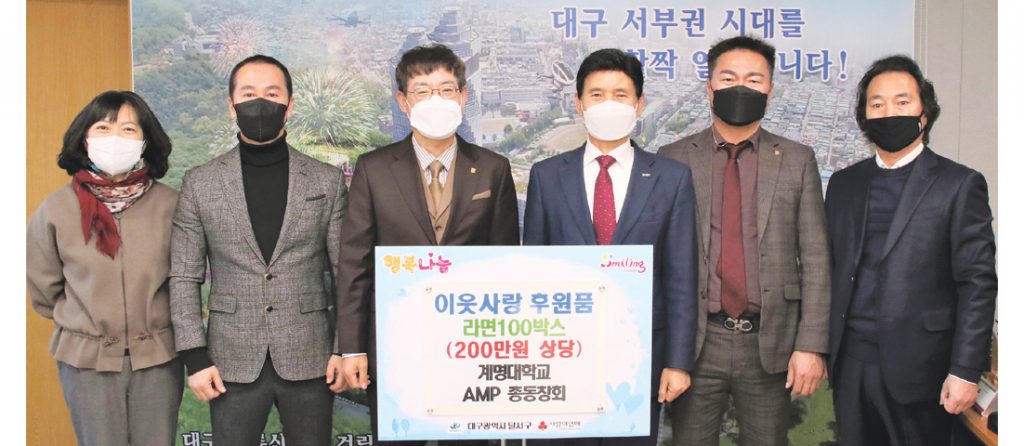 계명대학교 최고경영자과정(AMP) 총동창회(회장 황규건)는 지난달 25일(수) 라면 100박스(200만 원 상당)를 달서구에 후원했다.