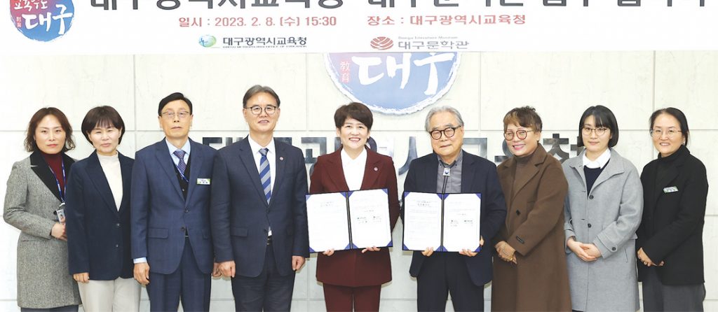 대구시교육청(교육감 강은희)은 지난 8일(수) 오후 3시 30분 시교육청 여민실에서 강은희 교육감, 하청호 관장 및 관계자들이 참석한 가운데 대구문학관과 독서인문교육 활성화를 위한 업무협약을 체결했다.