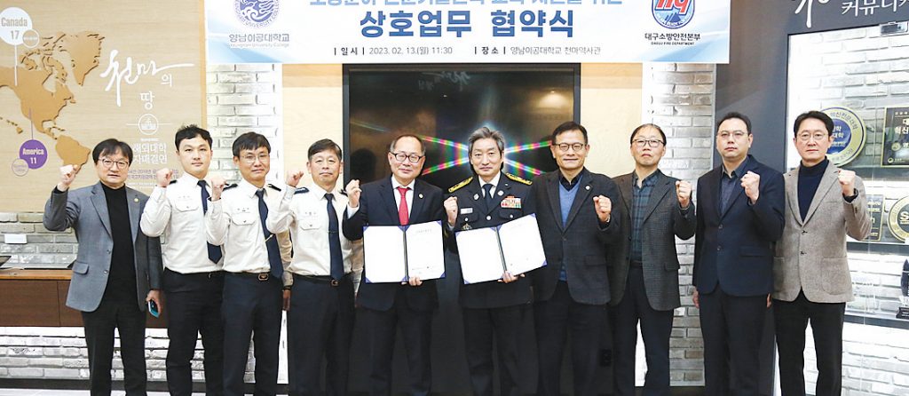 대구소방안전본부는 지난 13일(월) 영남이공대학교와 소방·안전 분야 전문인력 양성 교육 및 기술개발을 위해 업무 협약을 체결했다. 양 기관은 이번 협약을 통해 ▲ 정부와 지방자치단체 사업 협력 및 지원 ▲ 교육과정 및 기술 개발을 위한 협력 ▲ 공동사업 추진 ▲ 산·학·연·관 협력체계를 구축해 나갈 것을 약속했다. <자료제공:소방안전본부>
