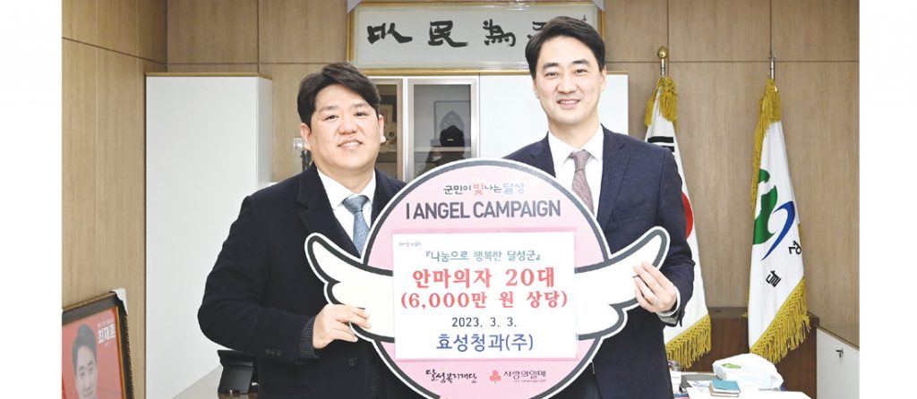 효성청과(주)(대표 김형수)는 지난 3일(금) 달성군 하빈면 경로당 20개소에 전달해 달라며 안마의자 20대(6,000만 원 상당)를 기탁했다.