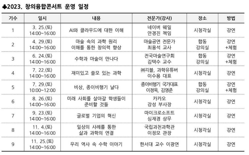 3월 강연에 이어서 ▲4월 ‘마술 속 과학 원리’(마술공연 전문가 최용석 교사), ▲6월 ‘마술과 함께 떠나는 여행’(전국마술연구회 김택수 교수), ▲7월 ‘재미있고 쓸모있는 과학’(110만 과학유튜버 ㈜긱불 이수용 대표), ‘비상, 종이비행기 날다’(종이비행기 국가대표 이정욱, 김영준 선수), ▲8월 ‘미래 사회를 살아갈 학생들이 준비해야 할 것’(카카오 강성 부사장), ▲9월 ‘글로벌 기업의 혁신’(마이크로소프트 심재경 상무), ▲11월 ‘일상의 사례를 통한 삶과 과학의 연결’(국립과천과학관 이정모 관장), ‘우리 역사 속 수학이야기’(한서대 이광연 교수)가 운영된다.
