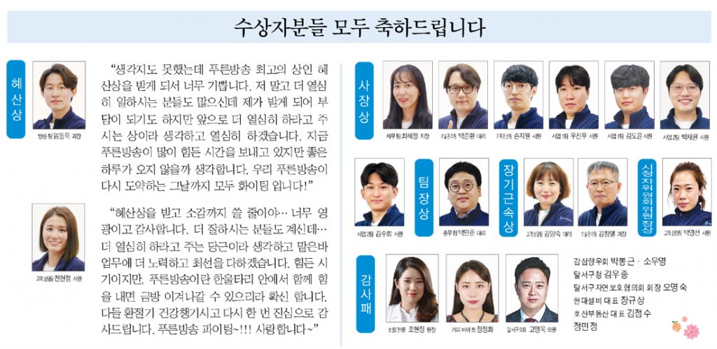 조현수 푸른방송 대표이사는 “힘들었던 비대면 시대를 지나와서 여러분들의 모습을 보니 정말 감회가 새롭고, 달서구를 대표하는 향토기업으로서 자부심 하나로 달려온 시간이었으며 뒤돌아 보면 어느새 그 시작점이 보이지 않을 만큼 긴 여정이었다. 임직원들의 노력과 희생을 토대로 하여 조직 간에 유기적 협력이 없었다면 불가능한 일이었다”고 말했다.