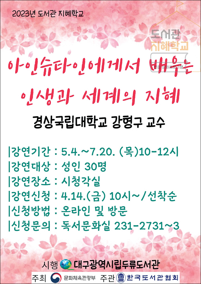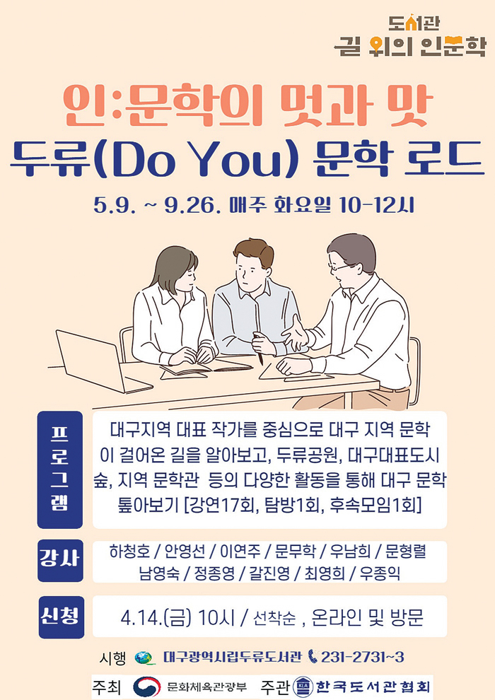 수강 신청은 4월 14일(금)부터 선착순으로 받고 있으며, 성인이면 누구나 신청할 수 있다. 신청은 도서관을 직접 방문하거나 두류도서관 홈페이지를 통한 온라인으로 가능하며, 기타 자세한 내용은 두류도서관 홈페이지(library.daegu.go.kr/duryu)를 참고하거나, 독서문화실(☎231-2730~3)로 문의하면 된다.