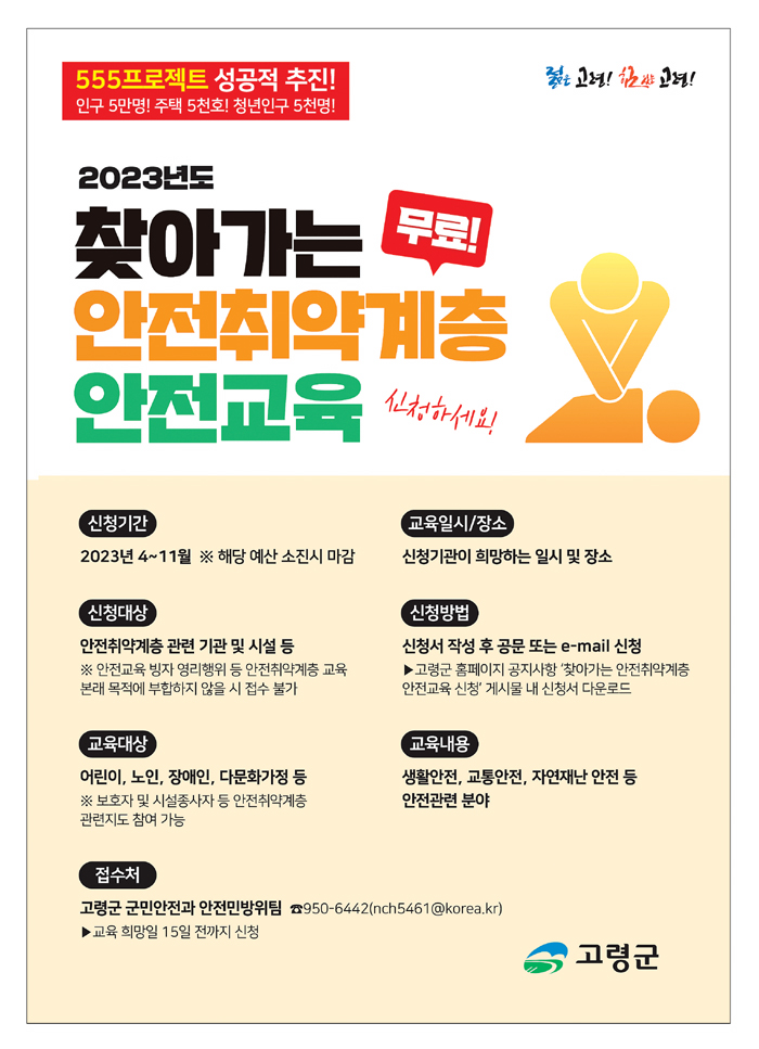 고령군은 어린이, 노인, 장애인, 다문화가정 등 신체·언어·위기 대처능력 등의 위험에 자주 노출되는 안전취약계층을 대상으로 찾아가는 안전 교육을 실시한다. 교육은 4~11월까지 신청을 받되 예산 소진 시 조기에 마감될 수 있으며 신청은 안전취약계층 안전교육 신청서를 작성해 군민안전과로 제출하면 된다.