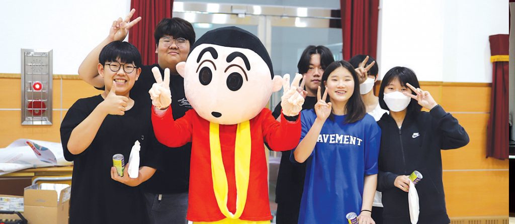 한울안중학교(교장 윤재철)는 지난 18일(화) 오후 짱구로 변신한 윤재철 교장이 교실을 돌며 학생들에게 간식을 나눠주었다. 일일 짱구로의 변신을 자처한 윤재철 교장은 도넛과 음료를 들고 수업 중인 교실을 예고 없이 방문해 학생들에게 웃음을 주었다.<자료제공:한울안중학교>