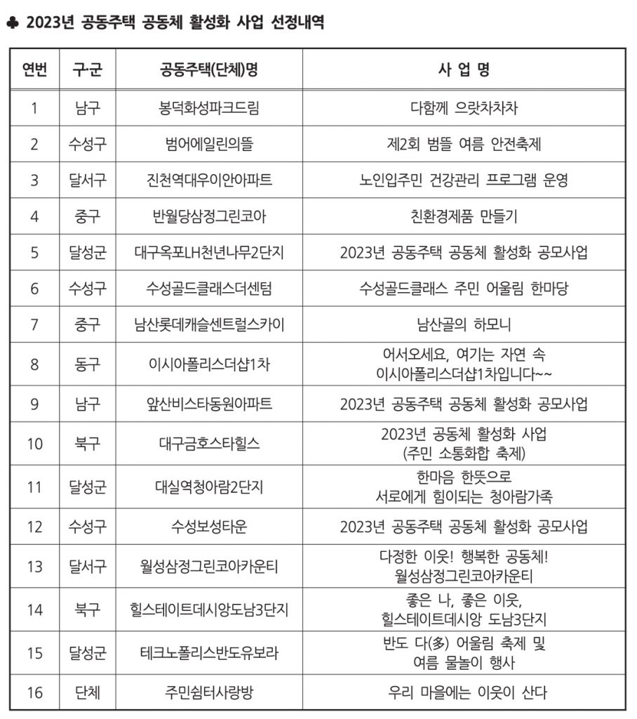 대구광역시, 2023년 공동주택 공동체 활성화 사업 16개 선정