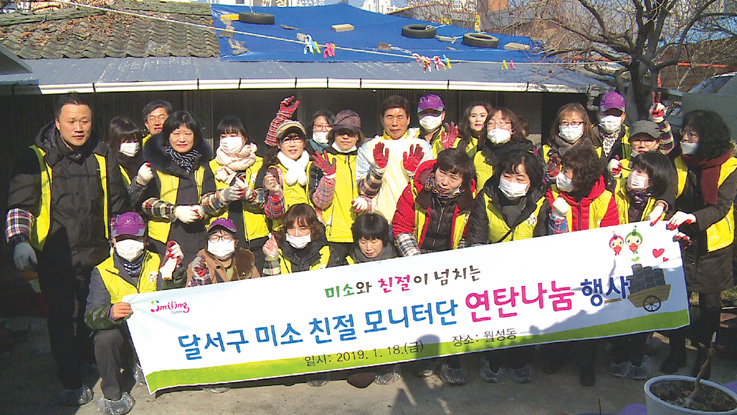 미소와 친절로 행복한 달서구를 만들기 위해 펼친 캠페인은, 행복나눔과를 통해 후원받은 ‘이웃사랑 연료뱅크’의 희망연탄을 전달하며 실천됐다.
