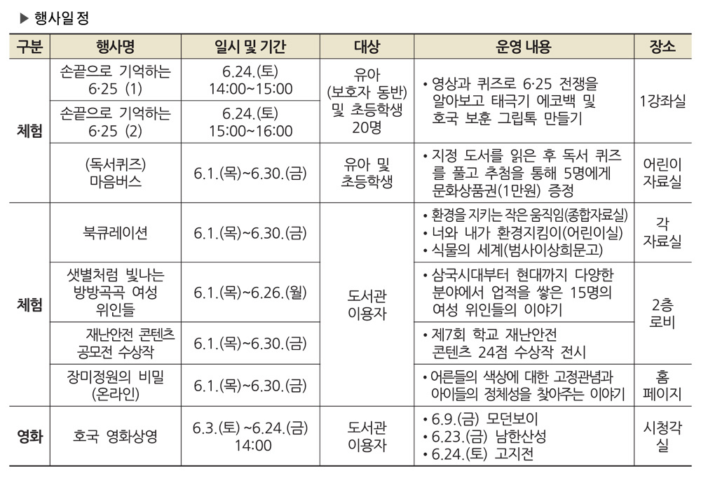 전시 행사는 ▲‘샛별처럼 빛나는 방방곡곡 여성 위인들’ 원화전시, ▲‘학교 재난안전 콘텐츠 공모전 수상작’전시, ▲‘장미정원의 비밀’(온라인) 원화전시를 운영하며, 도서관 2층 로비와 홈페이지(온라인 전시)를 통해 관람할 수 있다. 또한, 6월 6일 현충일과 6·25기념일을 전후로 학생 및 지역주민의 역사 인식 함양을 위해 호국 및 전쟁 관련 영화(매주 수, 금, 토 14:00)를 상영한다.