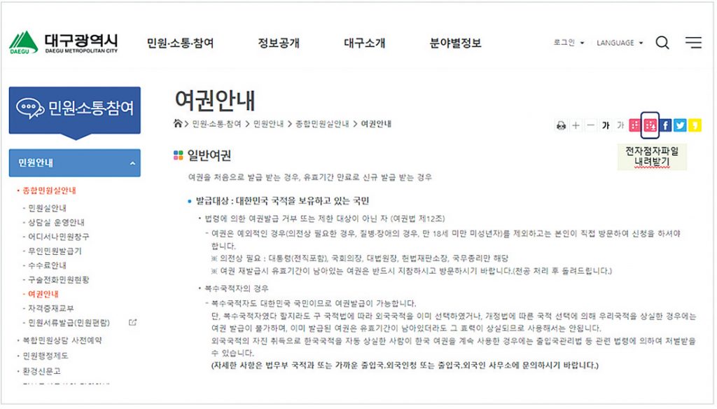 ‘전자점자 생성 서비스’는 시각장애인들에게 보다 정확한 정보를 제공하여 대구시정에 대한 알권리를 확보하기 위해, 대구광역시 누리집(홈페이지)에서 제공하는 각종 소식 및 분야별 정보를 전자점자 파일형태로 변환하여 제공하는 서비스이다.