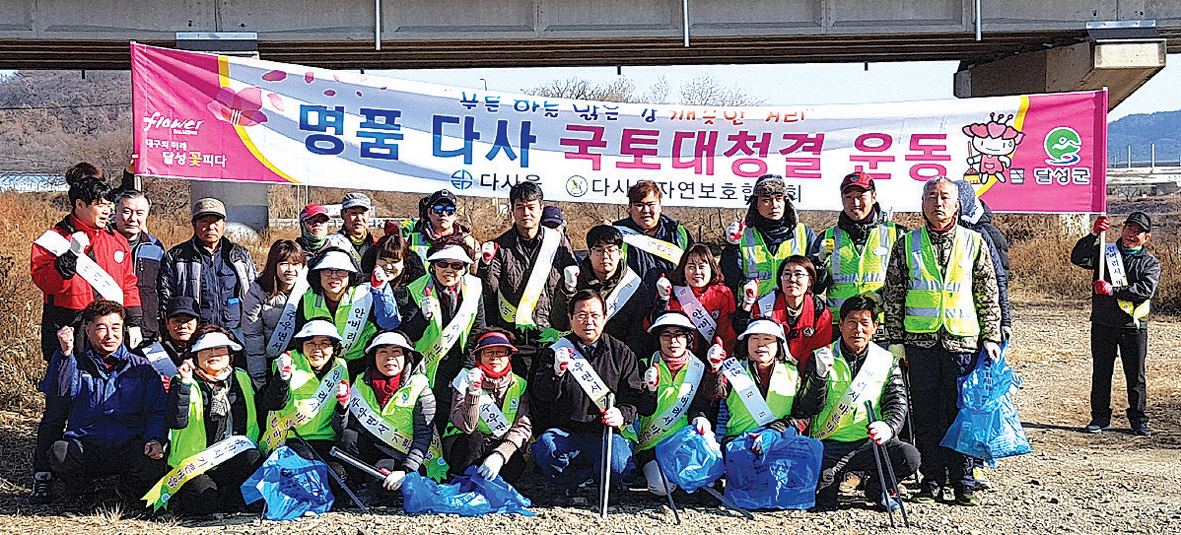 달성군 다사읍은 지난 24일 다사읍 자연보호협의회 회원 및 환경미화원 등 40여 명이 참여한 가운데 다사읍의 관문인 해랑교 천변 구간에서 ‘2019 설맞이 국토 대청결 운동’행사를 개최했다.