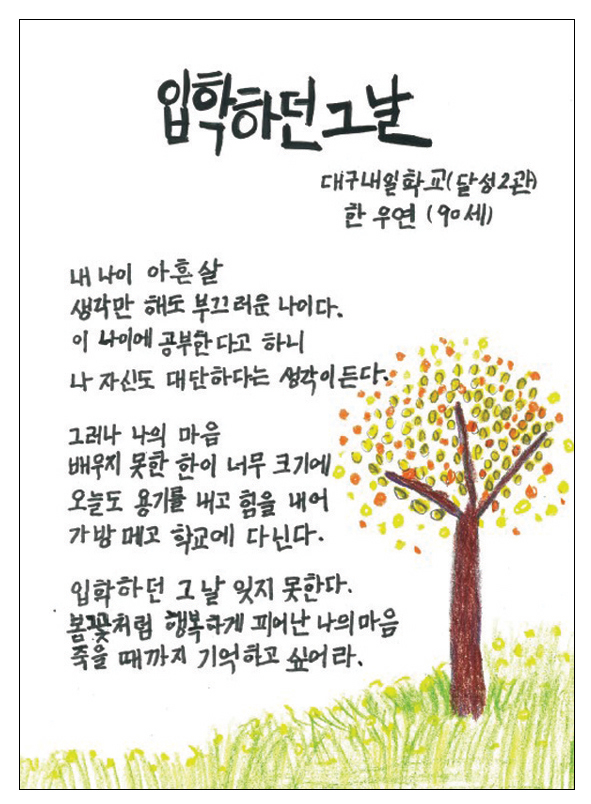 먼저, 대구시교육청은 시민들에게 대구내일학교 성인문해교육을 홍보하기 위해 6월 13일(화)~19일(월)까지 도시철도역사(중앙로역, 반월당역, 남산역)에서, 7월 1일(토)~31일(월)까지 대구광역시립수성도서관 및 대구2·28기념학생도서관에서 대구내일학교 졸업생 시화작품 전시회 ‘세상에서 가장 아름다운 시’를 개최한다.